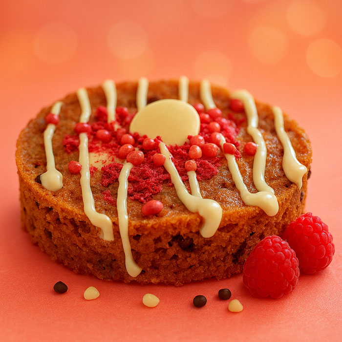 Les framboises fraîches et lyophilisées apportent un parfum fruité vibrant, à la fois acidulé et délicatement sucré, qui contraste à merveille avec la profondeur du chocolat noir et la tendresse du chocolat blanc. Chaque bouchée révèle un équilibre riche en émotions : un cookie fondant, gourmand, intensément fruité.
